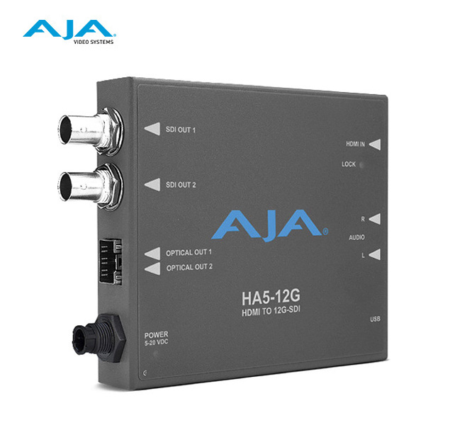 El HA5-12G de AJA convierte una entrada HDMI 2.0 a 12G-SDI para salidas de enlace único 4K/UltraHD. El HA5-12G incluye dos salidas de amplificador de distribución 12G-SDI con 8 o 2 canales de audio integrado desde una fuente HDMI o una entrada de audio analógico de dos canales (RCA).