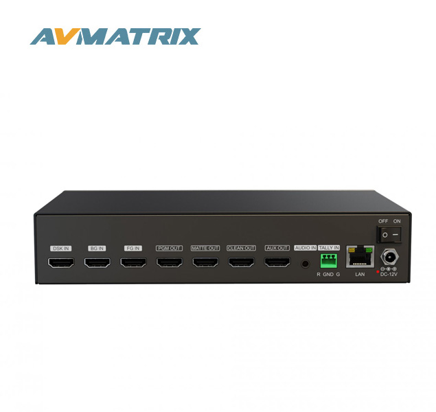 - 3 entradas HDMI 4K: compatibles con fuentes de clave en primer plano, fondo y DSK.