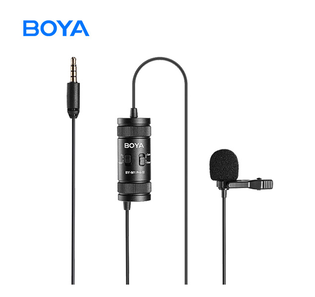 El BY-M1 Pro II es un micrófono lavalier universal, que no requiere pilas, y se energiza con los dispositivos externos a los que se ha conectado. Cuenta con una salida de audífonos para monitorear el audio procesado por el micrófono