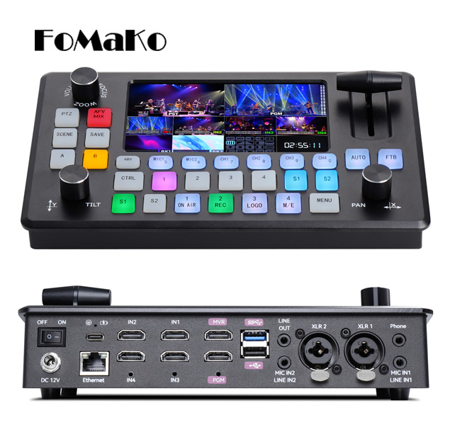 El panel Switcher de vídeo en directo FoMaKo es el primer monitor de 5,5 pulgadas y 10 pantallas con procesamiento de vídeo multicapa, transmisión UVC sin pérdidas YUY2, grabación con codificación dura VENC, procesamiento de audio profesional a nivel de tarjeta de sonido, producción de retransmisiones en directo con 4 cámaras, transmisión de audio y vídeo en directo altamente integrada y compacta con producción en directo a nivel de emisión mediante el control simultáneo de 4 cámaras PTZ. Con solo 29 botones, 3 mandos y una barra en T, el operador puede utilizar el panel M/E para realizar transmisiones en directo de forma fácil y sencilla.