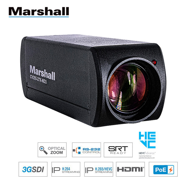 La cámara CV355-27X-ND3 con zoom óptico de 27X NDI® (NDI HX2, NDI HX3) utiliza un sensor profesional de 8,5 megapíxeles para capturar vídeo FHD nítido de hasta 1920 x 1080 a 60 fps, compatible con todos los formatos FHD. El diseño sencillo y la facilidad de uso de Marshall hacen de esta cámara una herramienta valiosa en una amplia variedad de aplicaciones de radiodifusión y audiovisuales profesionales.